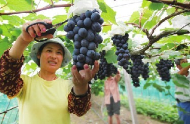 6月25日,泖港镇金泖葡萄良种园艺场员工们正在采摘今夏早熟的葡萄“夏黑”。据了解,该园种植了奥古斯特、巨玫瑰等40余个品种的葡萄