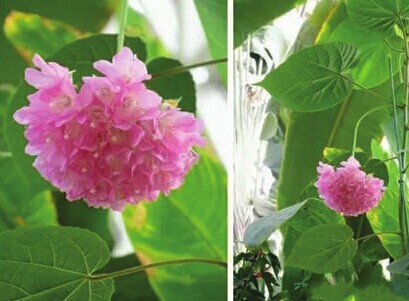 上海辰山植物园自2010年引进非洲芙蓉以来,至今已是第四次开花。本次开花较早的一批为人工扦插繁殖的盆栽苗,布置于馆内入口附近的展示台上。记者看到,开了花的非洲芙蓉,铃铛状的小花聚集成绣球状垂吊下来,20余朵小花构成悬垂花球正像是招亲时所抛的绣球,别有趣味。园内专家介绍称,其叶形和花色均与我国原产的木芙蓉有些相似,因此又别名吊芙蓉、百铃花(见右图)。